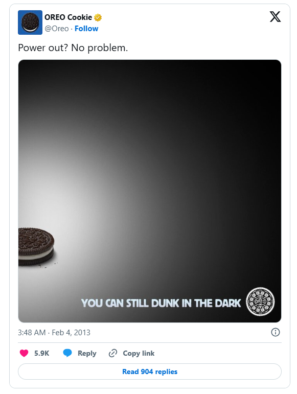 - Таймінг. Інтернет-тренди живуть годинами. Правило просте: «Будь першим або останнім». Крутий кейс — твіт бренду Oreo «Ви можете скуштувати темряву» під час несподіваного блекауту на Супербоулі-2013, який миттєво ретвітнули 15 тисяч разів.