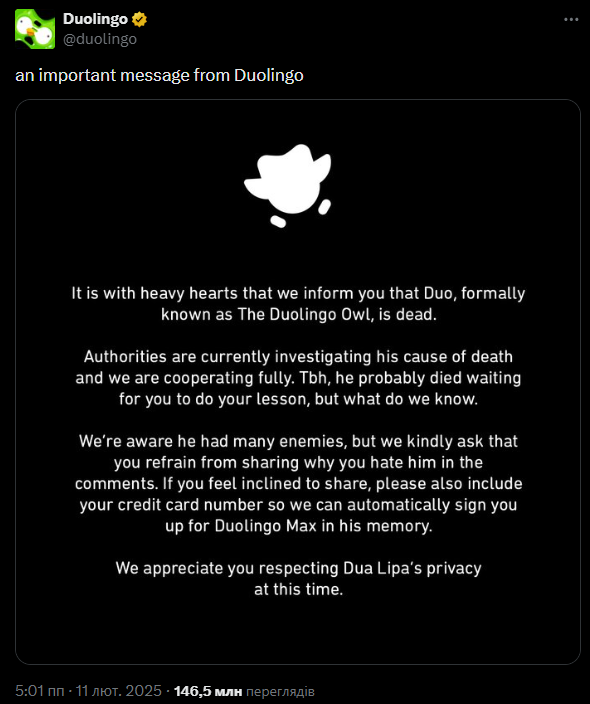 Разові меми — це добре, але зараз тренд зміщується в бік сторітелінгу. Бренди перетворюють свої кампанії на справжні серіали із залученням UGC (користувацького контенту). Класичний приклад — кампанія Duolingo у TikTok, де вони розіграли цілу драму зі «зникненням» своєї сови-маскота. Аудиторія тижнями генерувала контент, будуючи теорії змови, що дало застосунку колосальний буст завантажень. Тому створюйте історію, за якою хочеться стежити.